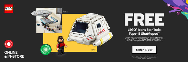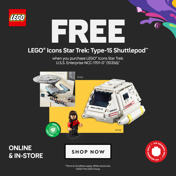 This offer is valid on 28.11.25, for one day only, while stocks last. Receive a FREE LEGO® Icons Star Trek: Type-15 Shuttlepod™ (40768) when you purchase the LEGO® Icons Star Trek: U.S.S. Enterprise NCC-1701-D™ (10356). This promotion is valid online (lego.bricksmegastore.com) and in all AG LEGO® Certified Stores in Australia and New Zealand. ONE per customer. Excludes purchase of gift cards. Offer valid for members of the AG LEGO® Certified Store VIP program only. The offer is not redeemable for cash and it cannot be redeemed against a prior purchase. Offer is available in conjunction with other offers. Offer is not available in conjunction with staff discount. If you return the LEGO® Icons Star Trek: U.S.S. Enterprise NCC-1701-D™ (10356), the LEGO® Icons Star Trek: Type-15 Shuttlepod™ (40768) gift with purchase must also be returned. AG LEGO® Certified Stores reserves the right to amend or cancel this promotion at any time without prior notice. Offer is not valid at LEGO.com, LEGOLAND® Parks, LEGOLAND® Discovery Centres or LEGO® Certified Store Dreamworld.