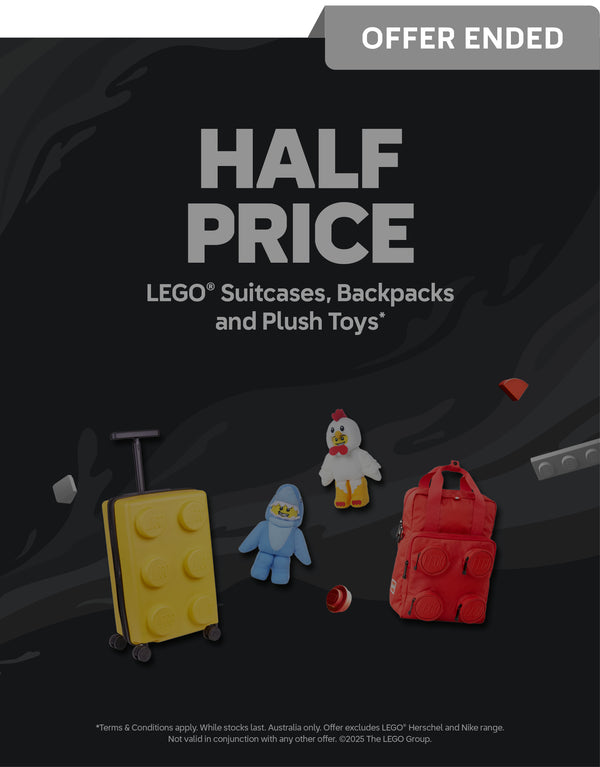 This offer is valid on 01.12.25, for one day only, while stocks last. Half Price LEGO® Suitcases, LEGO® Backpacks, & LEGO® Plush Toys. Offer excludes LEGO® Herschel range. This promotion is valid online(lego.bricksmegastore.com) in Australia only. Offer not available in-store. Offer not available in New Zealand. Offer valid for members of the AG LEGO® Certified Store VIP program only. The offer is not redeemable for cash, it cannot be redeemed against a prior purchase and is not available in conjunction with any other offer. Offer is not available in conjunction with staff discount. AG LEGO® Certified Stores reserves the right to amend or cancel this promotion at any time without prior notice. Offer is not valid at LEGO.com, LEGOLAND® Parks, LEGOLAND® Discovery Centres or LEGO® Certified Store Dreamworld.