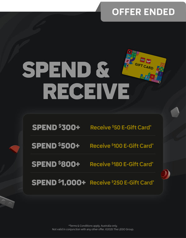 This offer is valid on 01.12.25, for one day only. Receive a FREE $50 AG LEGO® Certified Stores e-Gift Card when you spend $300 or more. Receive a FREE $100 AG LEGO® Certified Stores e-Gift Card when you spend $500 or more. Receive a FREE $180 AG LEGO® Certified Stores e-Gift Card when you spend $800 or more. Receive a FREE $250 AG LEGO® Certified Stores e-Gift Card when you spend $1000 or more. This promotion is valid online only (lego.bricksmegastore.com) in Australia only. Offer not available in New Zealand. Offer not available in-store. ONE per customer. Limit to one gift card per transaction, i.e. if you spend $800 or more, you will only receive 1 x $200 AG LEGO Certified Stores e-Gift card. E-Gift Card will be issued within 24 hours of transaction. Offer valid for members of the AG LEGO® Certified Store VIP program only. The offer is not redeemable for cash, it cannot be redeemed against a prior purchase and is not available in conjunction with any other offer. Offer not available with purchases of pre-orders. Offer is not available in conjunction with staff discount. If you return the product/s purchased to redeem the e-Gift Card and the total purchase equals less than the promotional spend threshold, then the e-Gift Card must also be returned. EFTPOS surcharges do not contribute to minimum spend threshold. AG LEGO® Certified Stores reserves the right to amend or cancel this promotion at any time without prior notice. Offer is not valid at LEGO.com, LEGOLAND® Parks, LEGOLAND® Discovery Centres or LEGO® Certified Store Dreamworld.