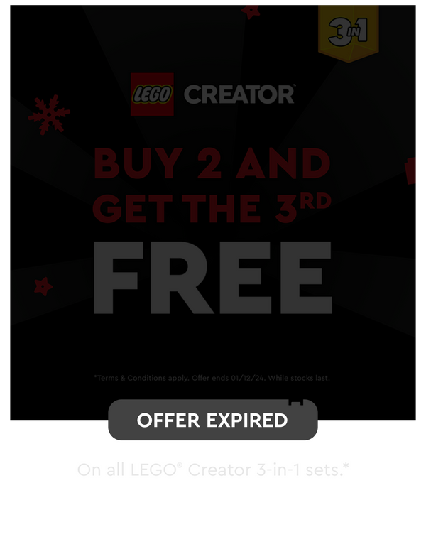 This offer is valid on 01.12.24, while stocks last. Buy any 2 LEGO® Creator 3-in-1 sets and get the third one for free. This promotion is valid online (lego.bricksmegastore.com) and in all AG LEGO® Certified Stores in Australia and New Zealand. FREE LEGO® Creator 3-in-1 set must be of equal or lesser value. Offer valid for members of the AG LEGO® Certified Store VIP program only. Offer is not available in conjunction with staff discount. Offer is not valid at LEGO.com, LEGOLAND® Parks, LEGOLAND Discovery Centres or LEGO® Dreamworld. The offer is not redeemable for cash and it cannot be redeemed against a prior purchase and is not available in conjunction with any other offer. Offer is not valid on gift cards. AG LEGO® Certified Stores reserves the right to amend or cancel this promotion at any time without prior notice.
