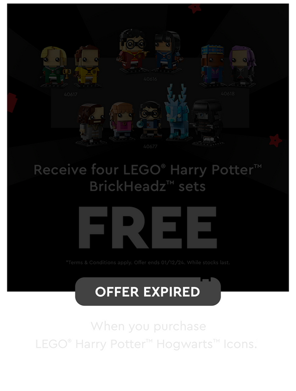 This offer is valid on 01.12.24, for one day only, while stocks last. Receive 4 FREE LEGO® BrickHeadz™ Harry Potter™ (40617, 40616, 40618, 40677) when you purchase either LEGO® Harry Potter™ The Burrow – Collectors’ Edition (76437) OR LEGO® Harry Potter™ Hogwarts™ Icons - Collectors' Edition (76391). This promotion is valid online (lego.bricksmegastore.com) and in all AG LEGO® Certified Stores in Australia and New Zealand. Limit ONE per customer. Excludes purchase of gift cards. Offer is available on full-priced products only. Offer valid for members of the AG LEGO® Certified Store VIP program only. The offer is not redeemable for cash and it cannot be redeemed against a prior purchase. Offer is not available in conjunction with staff discount. If you return the product purchased to redeem the 4 LEGO® BrickHeadz™ Harry Potter™ (40617, 40616, 40618, 40677) and the total purchase equals less than the full price value of the set then the 4 LEGO® BrickHeadz™ Harry Potter™ (40617, 40616, 40618, 40677) must also be returned. AG LEGO® Certified Stores reserves the right to amend or cancel this promotion at any time without prior notice. Offer is not valid at LEGO.com, LEGOLAND® Parks, LEGOLAND® Discovery Centres or LEGO® Certified Store Dreamworld.