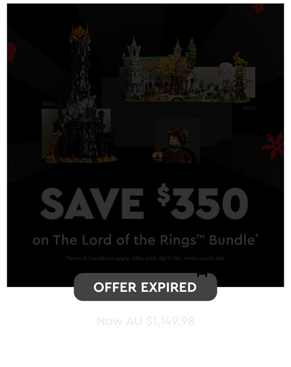 This offer is valid on 28.11.24, for one day only, while stocks last. Save $350 on The Lord of the Rings™ Bundle (10316, 10333). Now, $1,149.98. This promotion is valid online (lego.bricksmegastore.com) and in all AG LEGO® Certified Stores in Australia. Offer is not available to New Zealand customers. Customer limits may apply. Offer valid for members of the AG LEGO® Certified Store VIP program only. Offer is not valid in conjunction with staff discounts. Offer is not valid at LEGO.com, LEGOLAND® Parks, LEGOLAND® Discovery Centres or LEGO® Certified Store Dreamworld. The offer is not redeemable for cash and it cannot be redeemed against a prior purchase. AG LEGO® Certified Stores reserves the right to amend or cancel this promotion at any time without prior notice.