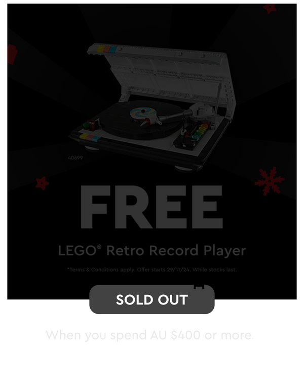 This offer is valid from 29.11.24, while stocks last. Receive a FREE LEGO® Retro Record Player (40699) when you spend $400 or more. This promotion is valid online (lego.bricksmegastore.com) and in all AG LEGO® Certified Stores in Australia. Offer not available in New Zealand. Limit ONE per customer. Excludes purchase of gift cards. Offer is available on full-priced products only. Offer valid for members of the AG LEGO® Certified Store VIP program only. The offer is not redeemable for cash, it cannot be redeemed against a prior purchase. Offer is available in conjunction with staff discount only if the total purchase value is over $400 after staff discount has been applied. If you return the product purchased to redeem the LEGO® Retro Record Player (40699) and the total purchase equals less than $400, then the LEGO® Retro Record Player (40699) must also be returned. AG LEGO® Certified Stores reserves the right to amend or cancel this promotion at any time without prior notice. Offer is not valid at LEGO.com, LEGOLAND® Parks, LEGOLAND® Discovery Centres or LEGO® Certified Store Dreamworld.