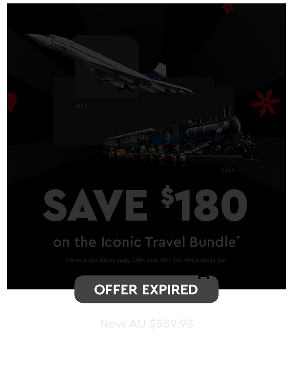 This offer is valid on 30.11.24, for one day only, while stocks last. Save $180 on the Iconic Travel bundle (21344, 10318). Now, $589.98. This promotion is valid online (lego.bricksmegastore.com) and in all AG LEGO® Certified Stores in Australia. Offer is not available to New Zealand customers. Customer limits may apply. Offer valid for members of the AG LEGO® Certified Store VIP program only. Offer is not valid in conjunction with staff discounts. Offer is not valid at LEGO.com, LEGOLAND® Parks, LEGOLAND® Discovery Centres or LEGO® Certified Store Dreamworld. The offer is not redeemable for cash and it cannot be redeemed against a prior purchase. AG LEGO® Certified Stores reserves the right to amend or cancel this promotion at any time without prior notice.