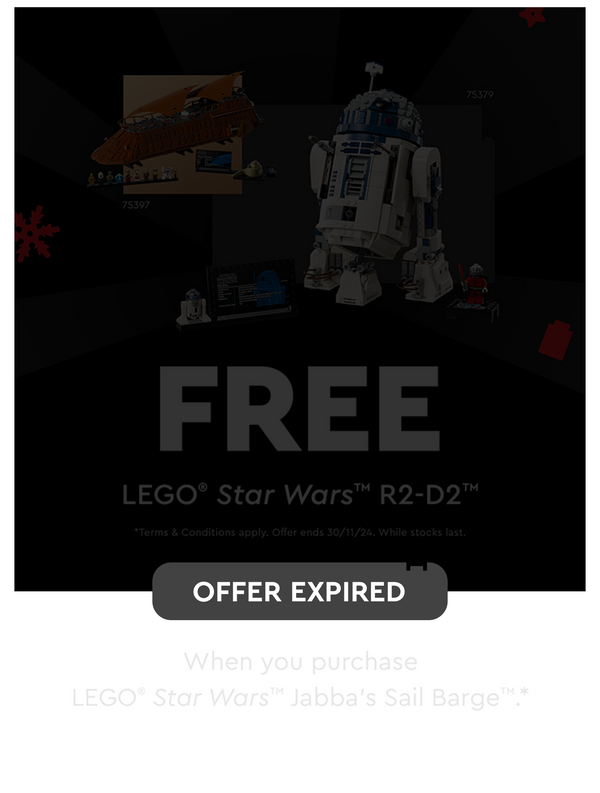 This offer is valid on 30.11.24, for one day only, while stocks last. Receive a FREE LEGO® Star Wars™ R2-D2™ (75379) when you purchase the LEGO® Star Wars™ Jabba’s Sail Barge™ (75397). This promotion is valid online (lego.bricksmegastore.com) and in all AG LEGO® Certified Stores in Australia and New Zealand. Limit ONE per customer. Excludes purchase of gift cards. Offer is available on full-priced products only. Offer valid for members of the AG LEGO® Certified Store VIP program only. The offer is not redeemable for cash, it cannot be redeemed against a prior purchase. Offer is not available in conjunction with staff discount. If you return the product purchased to redeem the LEGO® Star Wars™ R2-D2™ (75379) and the total purchase equals less than the full price value of the set then the LEGO® Star Wars™ R2-D2™ (75379) must also be returned. AG LEGO® Certified Stores reserves the right to amend or cancel this promotion at any time without prior notice. Offer is not valid at LEGO.com, LEGOLAND® Parks, LEGOLAND® Discovery Centres or LEGO® Certified Store Dreamworld.