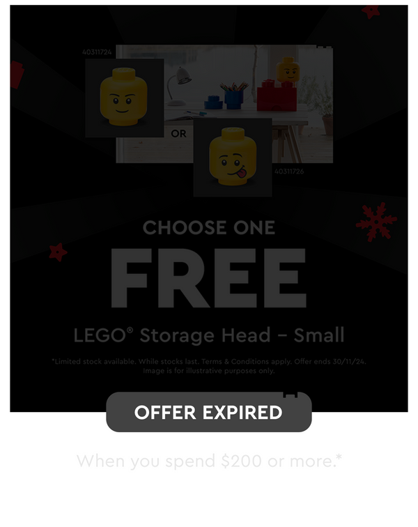 This offer is valid from 30.11.24, for one day only, while stocks last. Receive your choice of LEGO Storage Head Silly – Small (40311726) OR LEGO Storage Head Boy - Small (40311724) when you spend $200 or more. This promotion is valid online (lego.bricksmegastore.com) and in all AG LEGO® Certified Stores in Australia. Limit ONE per customer. Excludes purchase of gift cards. Offer is available on full-priced products only. Offer valid for members of the AG LEGO® Certified Store VIP program only. The offer is not redeemable for cash, it cannot be redeemed against a prior purchase. Offer is available in conjunction with staff discount only if the total purchase value is over $200 after staff discount has been applied. Choice of gift with purchase is final and cannot be swapped or exchanged after transaction. If you return the product purchased to redeem the LEGO Storage Head Silly – Small (40311726) OR LEGO Storage Head Boy - Small (40311724) and the total purchase equals less than $200, then the LEGO Storage Head Silly – Small (40311726) OR LEGO Storage Head Boy - Small (40311724) must also be returned. AG LEGO® Certified Stores reserves the right to amend or cancel this promotion at any time without prior notice. Offer is not valid at LEGO.com, LEGOLAND® Parks, LEGOLAND® Discovery Centres or LEGO® Certified Store Dreamworld.