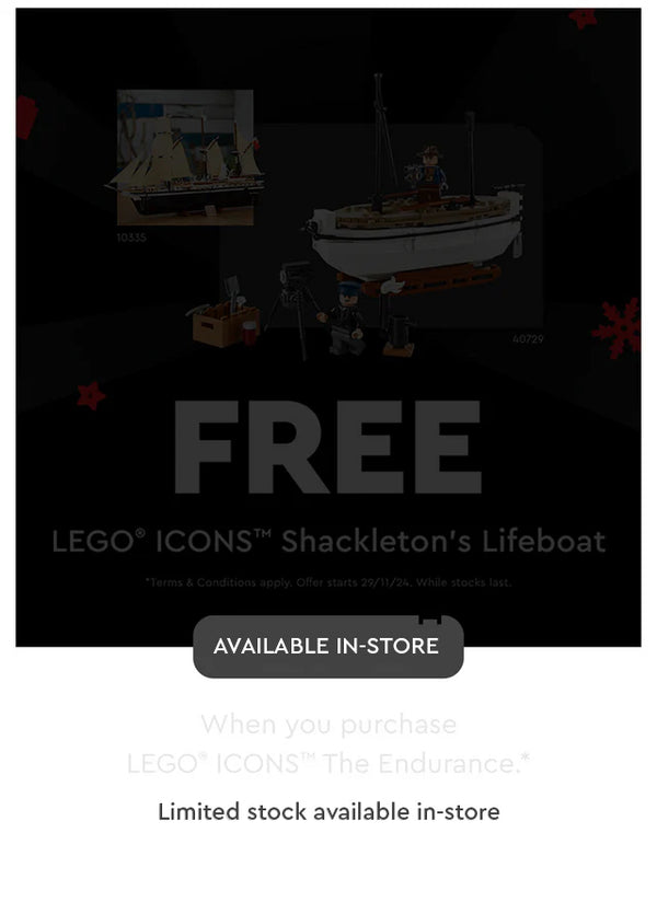 This offer is valid from 29.11.24, while stocks last. Receive a FREE LEGO® Icons Shackleton’s Lifeboat (40729) when you purchase the LEGO® Icons The Endurance (10335). This promotion was valid online (lego.bricksmegastore.com) Shipping orders only (click and collect not available) from 12am-2:50am AEDT and in all AG LEGO® Certified Stores in Australia. Limit ONE per customer. Excludes purchase of gift cards. Offer is available on full-priced products only. Offer valid for members of the AG LEGO® Certified Store VIP program only. The offer is not redeemable for cash, it cannot be redeemed against a prior purchase. Offer is not available in conjunction with staff discount. If you return the product purchased to redeem the LEGO® Icons Shackleton’s Lifeboat (40729) and the total purchase equals less than the full price value of the set then the LEGO® Icons Shackleton’s Lifeboat (40729) must also be returned. AG LEGO® Certified Stores reserves the right to amend or cancel this promotion at any time without prior notice. Offer is not valid at LEGO.com, LEGOLAND® Parks, LEGOLAND® Discovery Centres or LEGO® Certified Store Dreamworld.