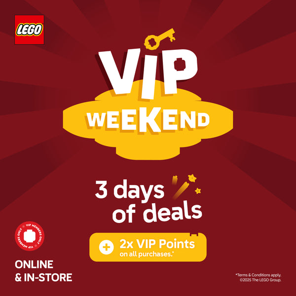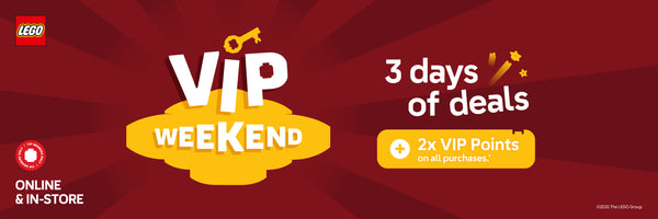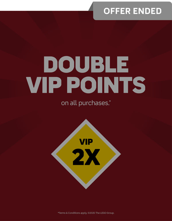 This offer is valid from 21.11.25 to 23.11.25. Receive Double VIP Points on all purchases. Offer is valid online (lego.bricksmegastore.com) and in all AG LEGO® Certified Stores in Australia and New Zealand. Offer valid for members of the AG LEGO® Certified Store VIP program only. Offer not available with purchase of pre-orders. The offer is not redeemable for cash; it cannot be redeemed against a prior purchase and is not available in conjunction with staff discount. AG LEGO® Certified Stores reserves the right to amend or cancel this promotion at any time without prior notice. Offer is not valid at LEGO.com, LEGOLAND® Parks, LEGOLAND® Discovery Centres or LEGO® Certified Store Dreamworld.