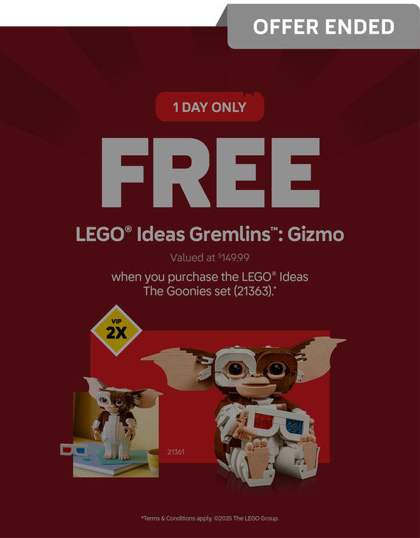 This offer is valid on 21.11.25, for one day only, while stocks last. FREE LEGO® Ideas Gremlins™: Gizmo (21361) when you purchase LEGO® Ideas The Goonies (21363). Valued at AU $149.99 / NZ $169.99. This promotion is valid online (lego.bricksmegastore.com) and in all AG LEGO® Certified Stores in Australia and New Zealand. ONE per customer. Offer valid for members of the AG LEGO® Certified Store VIP program only. The offer is not redeemable for cash; it cannot be redeemed against a prior purchase and is not available in conjunction with any other offer. Offer not available in conjunction with staff discount. If you return either the LEGO® Ideas The Goonies (21363) or the LEGO® Ideas Gremlins™: Gizmo (21361), then the LEGO® Ideas The Goonies (21363) and LEGO® Ideas Gremlins™: Gizmo (21361) purchased in conjunction must also be returned. AG LEGO® Certified Stores reserves the right to amend or cancel this promotion at any time without prior notice. Offer is not valid at LEGO.com, LEGOLAND® Parks, LEGOLAND® Discovery Centres or LEGO® Certified Store Dreamworld.