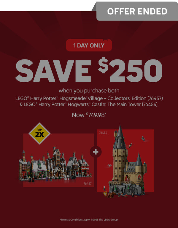 This offer is valid on 21.11.25, for one day only, while stocks last. SAVE $250 when you purchase the LEGO® Harry Potter™ Hogsmeade™ Village – Collectors' Edition (76457) & LEGO® Harry Potter™ Hogwarts™ Castle: The Main Tower (76454). Now AU $749.98 / NZ $849.98. This promotion is valid online (lego.bricksmegastore.com) and in all AG LEGO® Certified Stores in Australia and New Zealand. ONE BUNDLE per customer. Offer valid for members of the AG LEGO® Certified Store VIP program only. The offer is not redeemable for cash; it cannot be redeemed against a prior purchase and is not available in conjunction with any other offer. Offer not available in conjunction with staff discount. If you return either the LEGO® Harry Potter™ Hogsmeade™ Village – Collectors' Edition (76457) or LEGO® Harry Potter™ Hogwarts™ Castle: The Main Tower (76454), then the LEGO® Harry Potter™ Hogsmeade™ Village – Collectors' Edition (76457) or LEGO® Harry Potter™ Hogwarts™ Castle: The Main Tower (76454) purchased in conjunction must also be returned. AG LEGO® Certified Stores reserves the right to amend or cancel this promotion at any time without prior notice. Offer is not valid at LEGO.com, LEGOLAND® Parks, LEGOLAND® Discovery Centres or LEGO® Certified Store Dreamworld.