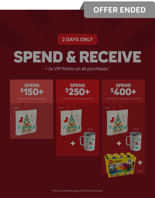 This offer is valid on 22.11.25 to 23.11.25, while stocks last. Receive a FREE LEGO® Holiday Tote Bag (112323) when you spend $150 or more.Receive a FREE LEGO® Stainless-Steel Cup (112020) & LEGO® Holiday Tote Bag (112323) when you spend $250 or more. Receive a FREE LEGO® Large Creative Brick Box (10698) & LEGO® Stainless-Steel Cup (112020) & LEGO® Holiday Tote Bag (112323) when you spend $400 or more. This promotion is valid online (lego.bricksmegastore.com) and in all AG LEGO® Certified Stores in Australia and New Zealand. ONE of each per customer. Offer valid for members of the AG LEGO® Certified Store VIP program only. The offer is not redeemable for cash; it cannot be redeemed against a prior purchase and is not available in conjunction with any other offer. Offer is available in conjunction with staff discount only if the total purchase value is over the required spend threshold after staff discount has been applied. If you return the product(s) purchased to redeem the LEGO® Holiday Tote Bag (112323), LEGO® Stainless-Steel Cup (112020), or LEGO® Large Creative Brick Box (10698) and the total purchase equals less than the qualifying spend threshold, then the gift with purchase/s must also be returned. AG LEGO® Certified Stores reserves the right to amend or cancel this promotion at any time without prior notice. Offer is not valid at LEGO.com, LEGOLAND® Parks, LEGOLAND® Discovery Centres or LEGO® Certified Store Dreamworld.