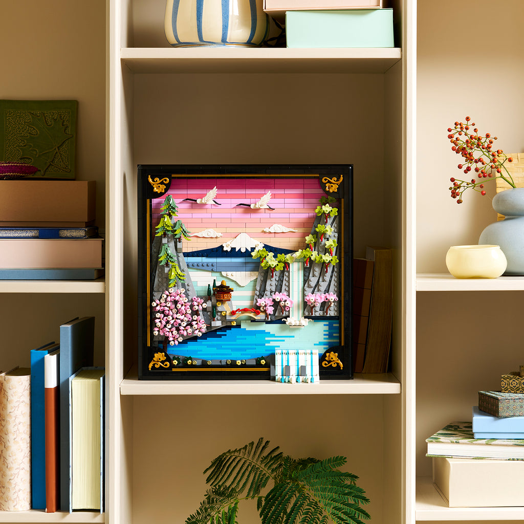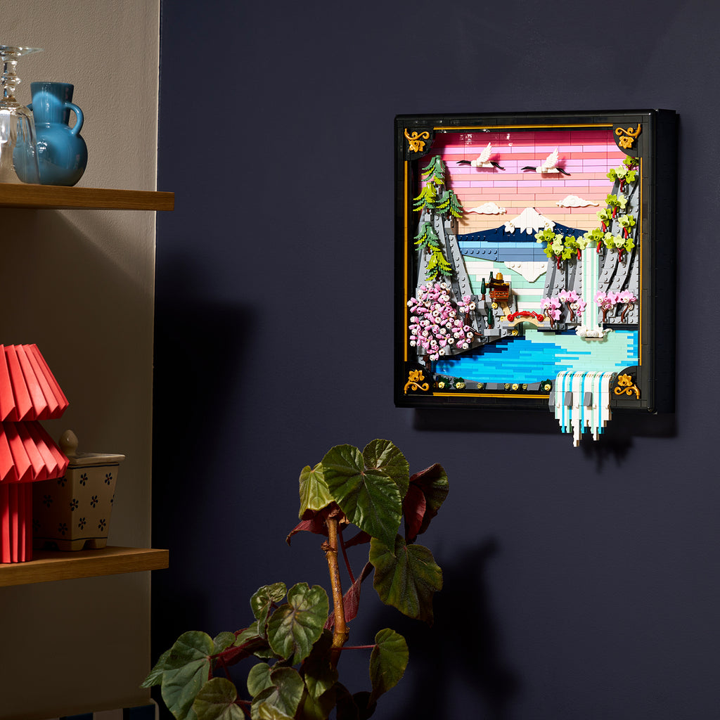 Bring colour and nature into your home with this LEGO® Art Japanese Cherry Blossom Landscape (31218) building set for adults. Inspired by the beauty of springtime in Japan and the country’s Ukiyo-e artists, this stunning brick-built 3D wall art features Mount Fuji, a teahouse, a bridge, a waterfall, flying Japanese cranes, and cherry blossom, ‘Sango-Kaku’ maple and Japanese umbrella pine trees.