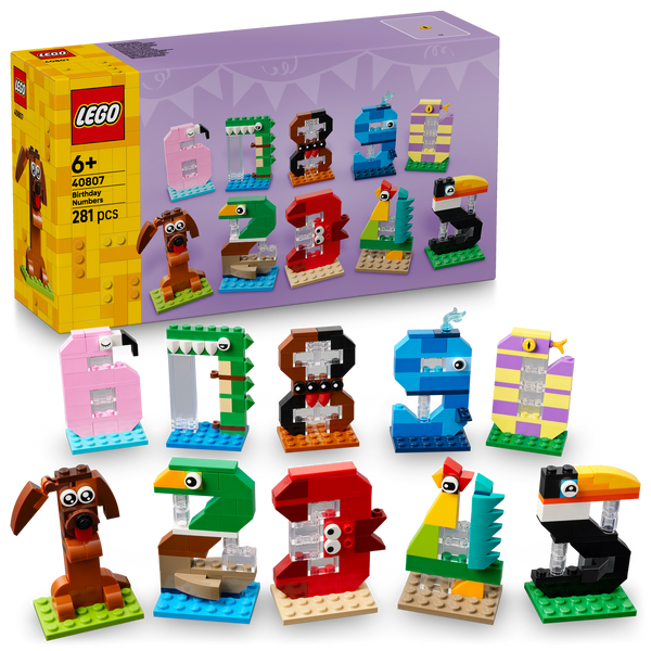Celebrate birthdays with the LEGO® Birthday Numbers (40807) building set for kids aged 6 and over. Featuring 10 buildable animal numbers, this set lets boys and girls have fun assembling colourful digits before using them as birthday cake toppers or animal decor.