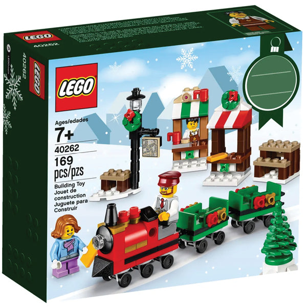 - Features a red locomotive with 2 green carriages, a lamppost with a city map, 2 shop stalls, a holiday tree and various buildable accessories and elements, including cups, wreaths and a bench.