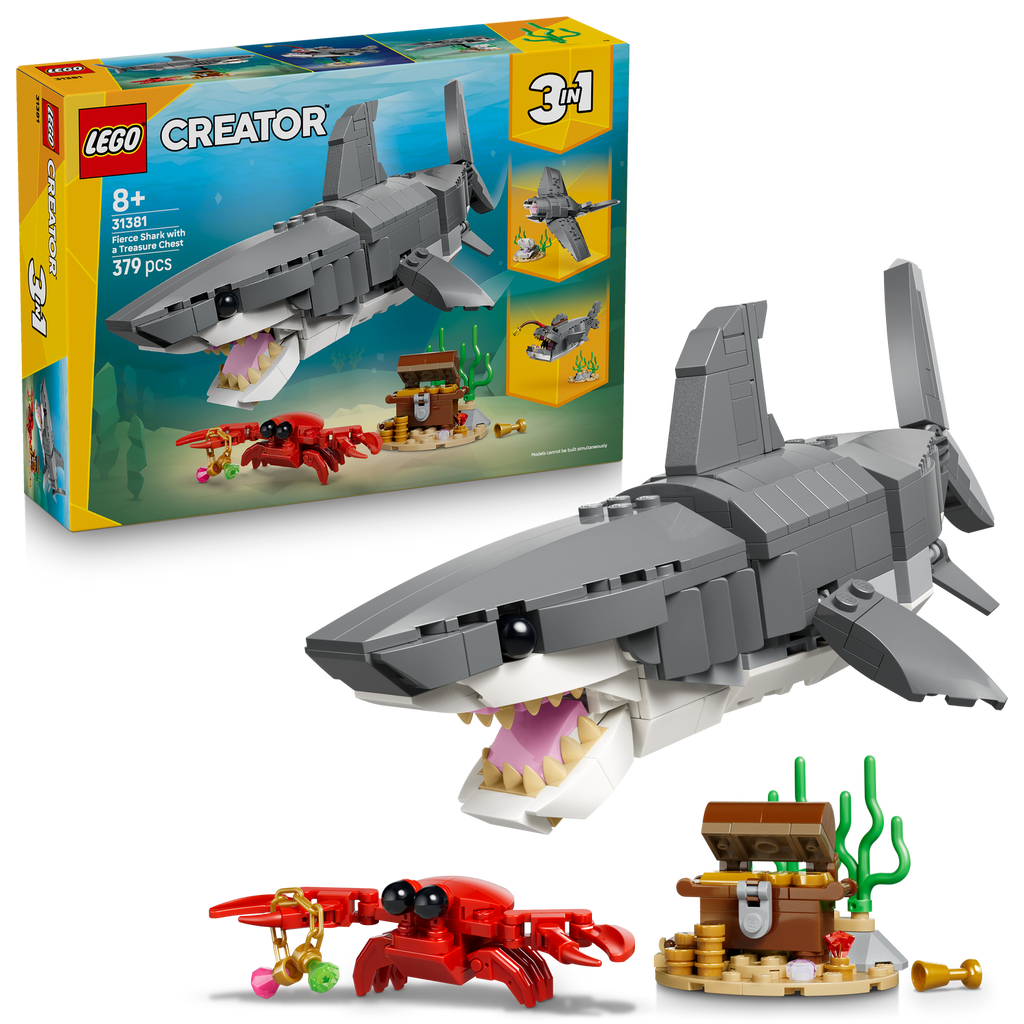 - 3 IN 1 SEA ANIMAL TOYS – LEGO® Creator 3 in 1 Fierce Shark with a Treasure Chest (31381) building toy lets boys and girls aged 8+ build and rebuild 3 ocean animal figures with the same bricks