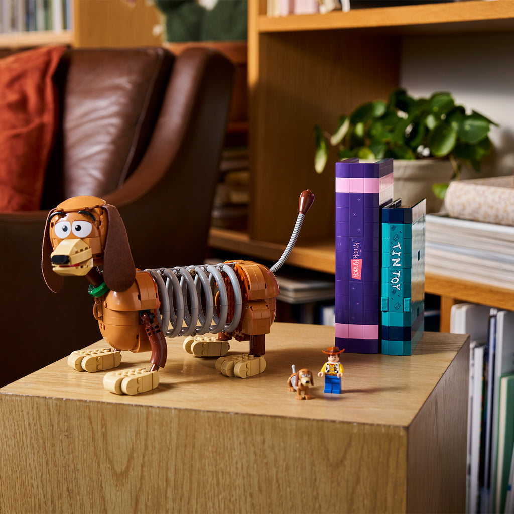 - DESK DECORATION – The building kit lets you display Slinky Dog in 2 ways: connected to the brick-built books as bookends or on his own; plus, he has a moving head and tail, and his paws can move slightly