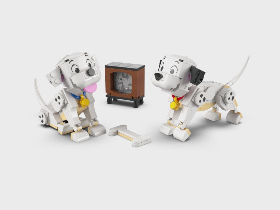 - Dalmatian puppies everywhere – This kids’ building toy features Lucky and Penny LEGO® ǀ Disney characters from the classic movie 101 Dalmatians, plus a brick-built bone and a small TV with screen
