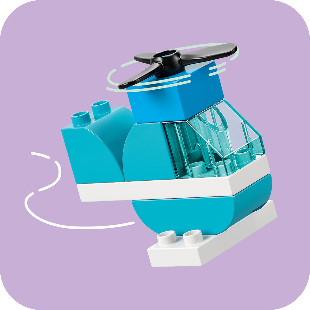 - EVERYDAY VEHICLES – Toddler building kit’s main models include a small car toy, a LEGO® DUPLO® helicopter with a spinning rotor, a dumper truck with a tipping bed and a fire engine toy with a ladder and more