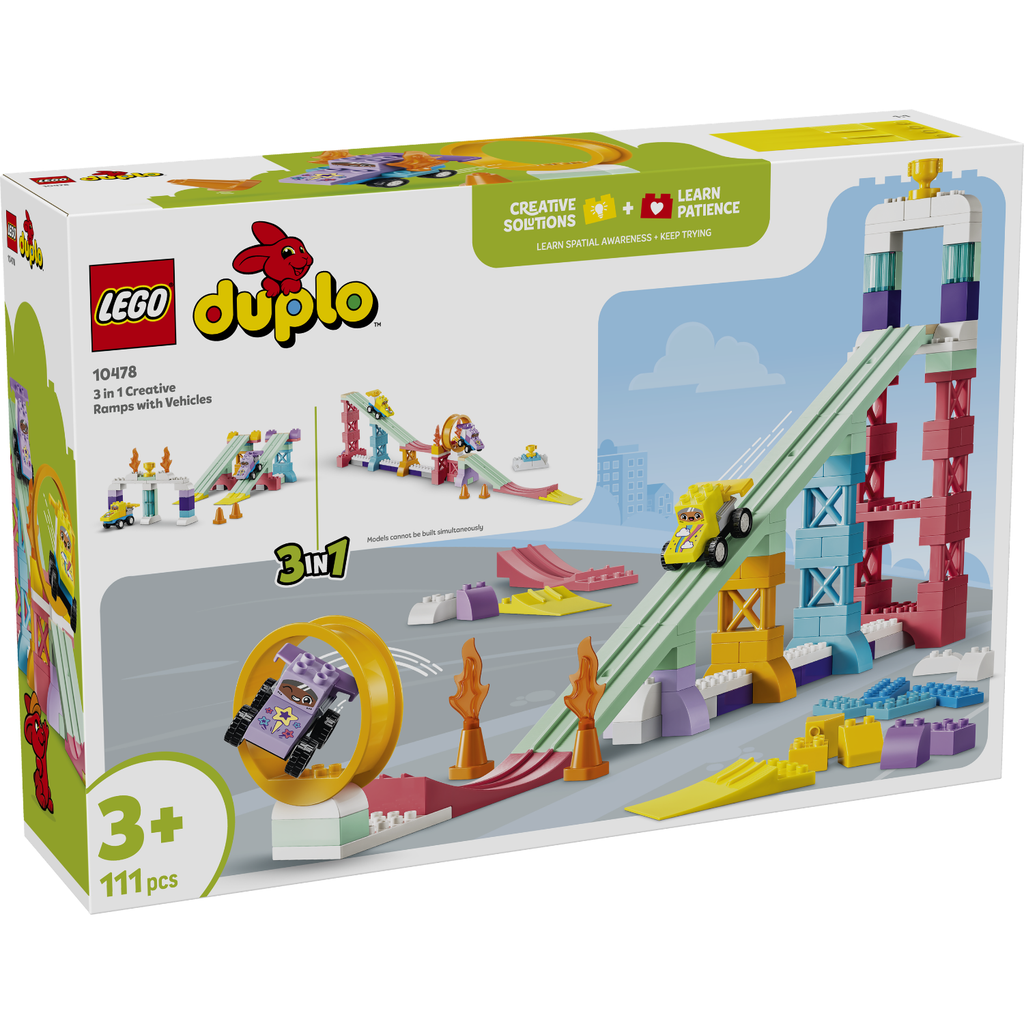 Rev up playtime fun with the LEGO® DUPLO® Town 3 in 1 Creative Ramps with Vehicles (10478) building toy. This set inspires hours of fun car play and learning with 2 race cars and bricks that rebuild into 3 different sets of ramps.