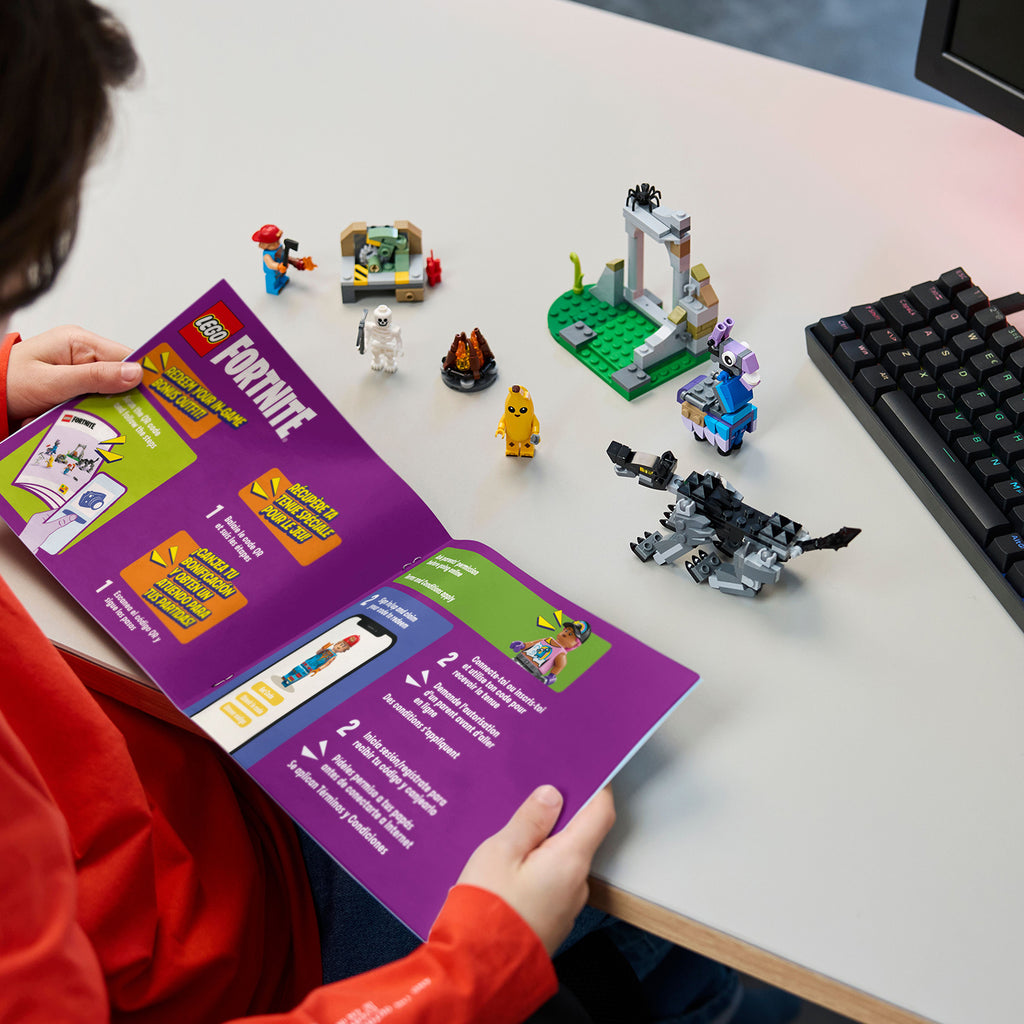 The playset replicates the first challenges players encounter in the LEGO Fortnite Odyssey video game, and boys and girls will have fun building the campfire, a workbench and ruins that can be deconstructed and reconfigured. It also features a Supply Llama figure and a wolf figure with a movable tail and legs. The action is brought to life by minifigures of Peely, Sparkplug and a skeleton, who come with weapon accessories to encourage imaginative role play.