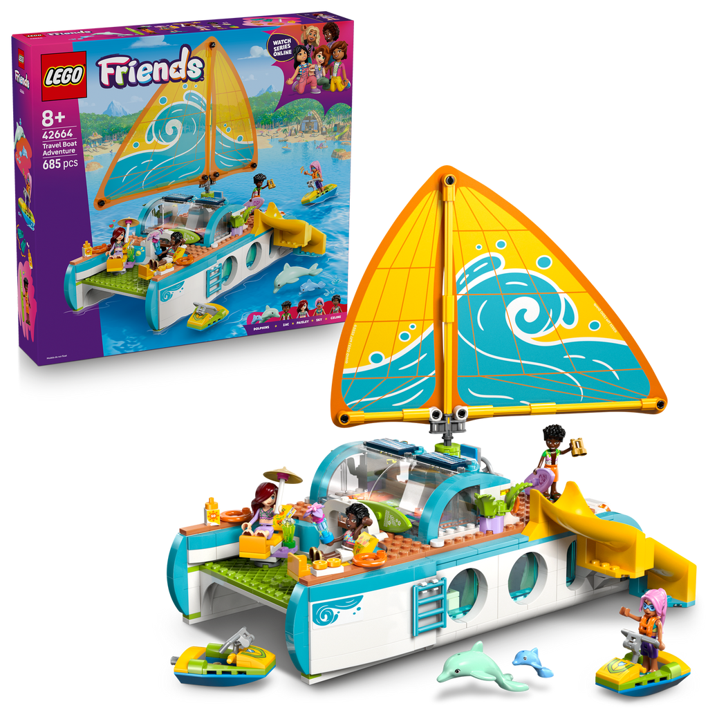 Travel Boat Adventure (42664) for girls and boys aged 8 and up comes with 4 LEGO Friends minidolls and heaps of accessories for imaginative play. The detailed boat is packed with realistic features like the sail, which moves when kids turn the wheel!