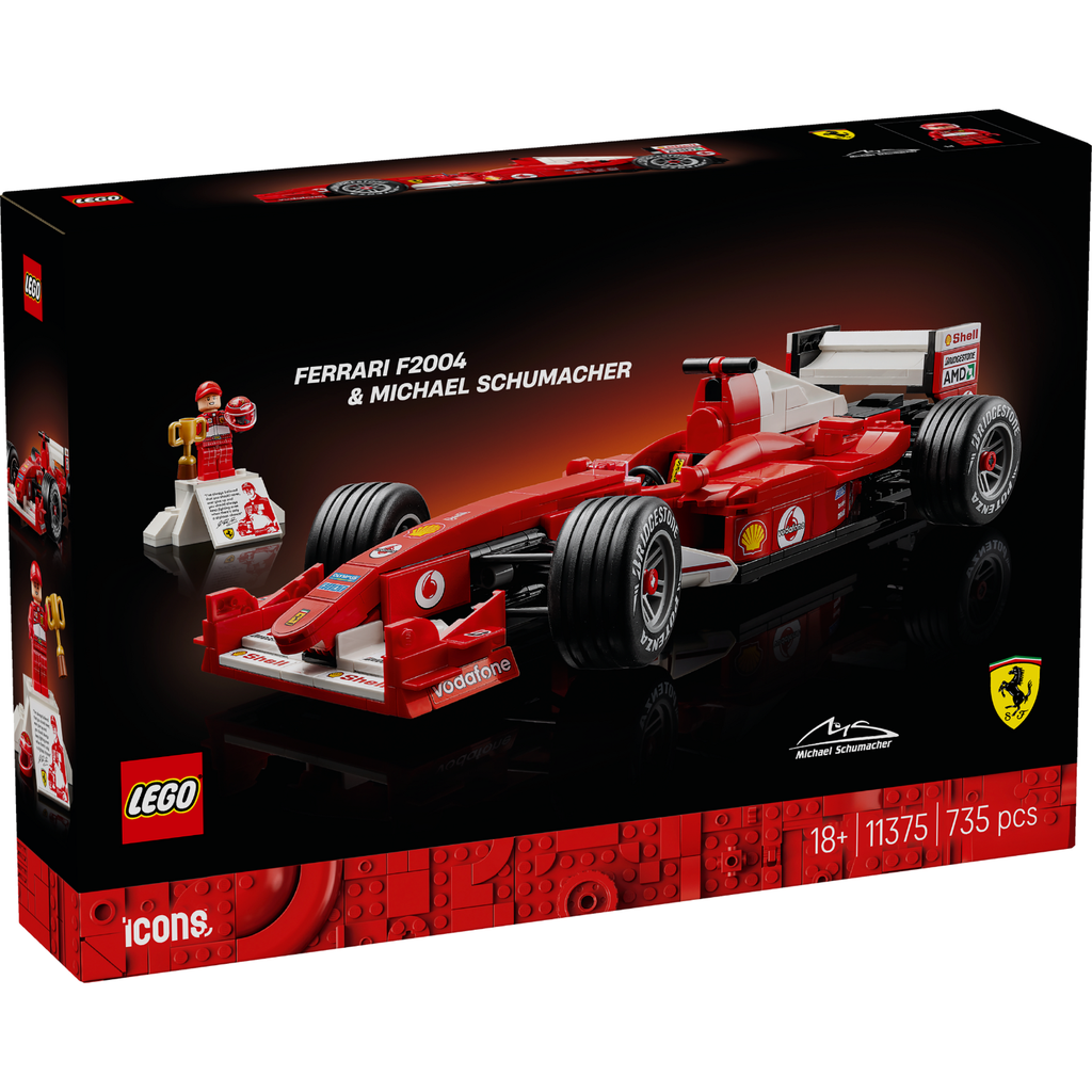 Celebrate a golden era of Formula 1 racing with the LEGO® Icons Ferrari F2004 & Michael Schumacher (11375) model car kit. Craft an in-scale replica of the legendary race car that, with Michael Schumacher at the wheel, dominated the 2004 racing season. The model Ferrari features working steering, grooved slick tyres and a detailed V10 engine, plus a display stand with vehicle details and stats. The Michael Schumacher minifigure comes with a helmet, winner’s trophy and a podium-style display stand with a printed image and a quote from the seven-time world champion.