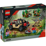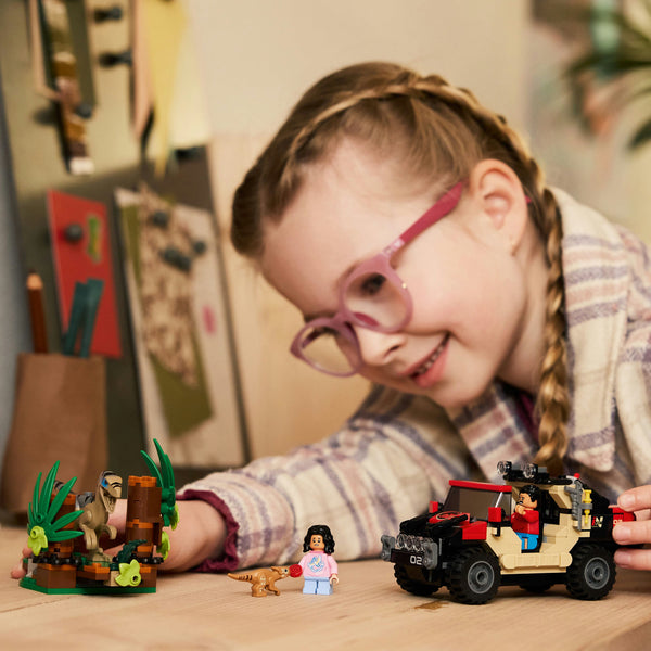 - Creative building kit – Includes moulded LEGO® dinosaur figures of a baby Aquilops and a Velociraptor, plus an off-road vehicle and Reuben and Isabella minifigures to spark dinosaur hunt play