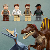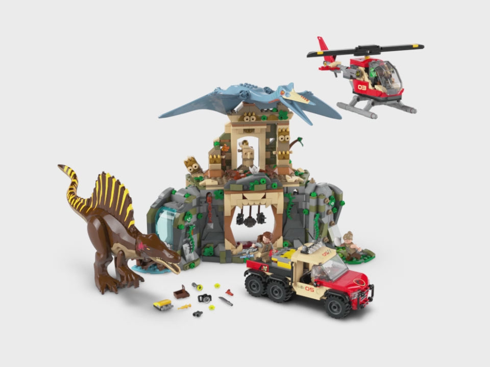 - Jurassic World Rebirth toys in a LEGO® box – Molded Spinosaurus and Quetzalcoatlus figures, 4 movie character minifigures, an ancient temple, a toy helicopter and dinosaur truck toy, plus lots of details