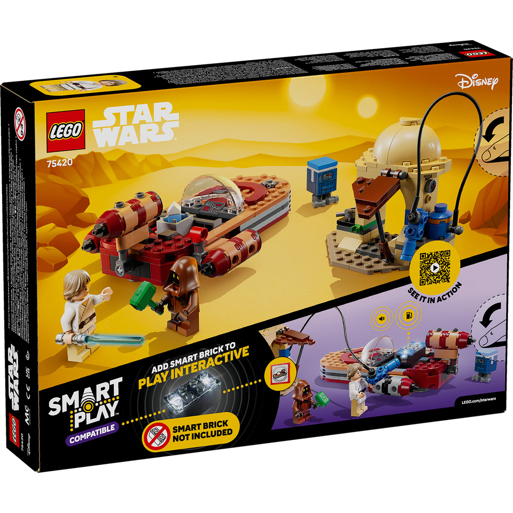 This LEGO SMART Play™ Compatible Set includes a SMART Luke Skywalker LEGO minifigure, a Jawa LEGO minifigure and a Gonk Droid, plus a SMART Tag. Add a SMART Brick from All-In-One Sets 75421, 75423 or 75427 (sold separately) for interactive play, bringing SMART Luke Skywalker to life and activating dynamic lights and sounds when fuelling, repairing and driving the landspeeder.