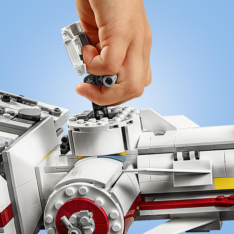 Build, play and display a legendary Star Wars™ starship! This LEGO® Star Wars 75244 interpretation of Tantive IV, seen fleeing from an Imperial Star Destroyer in the opening moments of Star Wars: A New Hope, faithfully recreates all of the Rebel cruisers signature details, including an elongated hull, detachable escape pods, elevating gun turrets, cargo hold and 11 massive engines at the back. Remove the hull plating of this fantastic LEGO Star Wars vehicle to reveal a detailed 2-minifigure cockpit, conference area with table, weapon rack and a control console with 2 seats. The radar dish also doubles as a convenient carry handle, which makes it perfect for flying around the room. When the mission is over, this amazing kids’ buildable toy also makes a great centerpiece for any LEGO Star Wars collection. The set also includes 5 minifigures and an R2D2 droid LEGO figure.